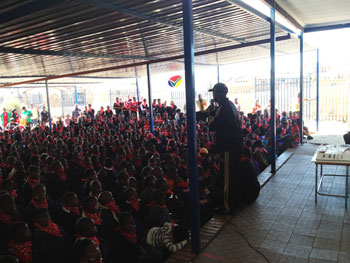 Here in picture is Tbo Touch addressing students of Motjoli Primary School.